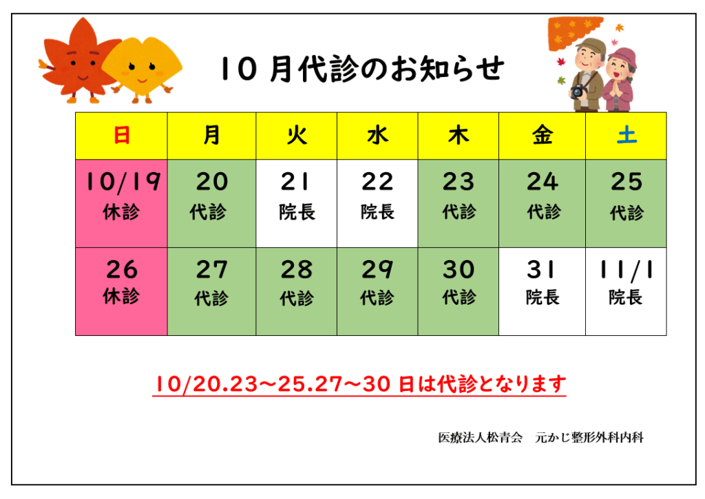 TOP > お知らせ一覧 > 10月代診のおしらせ